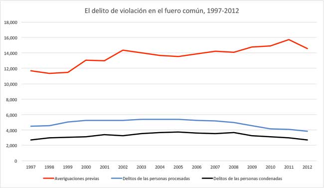 Segundo: la violación es el único delito sexual, relevante para este texto, sobre el cual se puede saber cuántas averiguaciones previas se abrieron entre 1997 y 2012, así como el número de delitos y personas que se llegaron a procesar y condenar en estos años. Lo que revela un análisis de estos datos es que existe una brecha nada desdeñable entre las averiguaciones previas que se inician y los casos que se llegan a consignar frente a un tribunal. Algo que, por supuesto, no sorprende si se toma en consideración los múltiples estudios que se han hecho sobre el sistema de procuración de justicia (así como los datos que año tras año arroja la ENVIPE).12 Guillermo Zepeda Lecuona lo dijo hace tiempo: la averiguación previa funciona como el nodo central o “el corazón de la impunidad” en México.