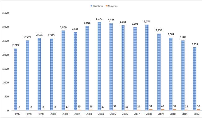 Gráfica 2. Hombres y mujeres condenadas por violación, en el fuero común entre 1997-2012