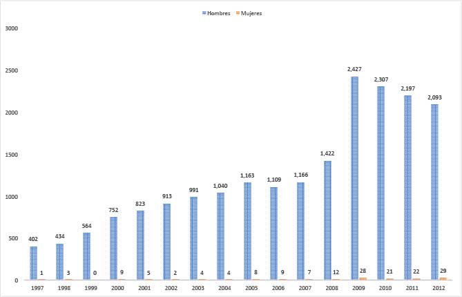 Fuente: “Judiciales en materia penal” del INEGI, que contiene datos para los años 1997-2012.