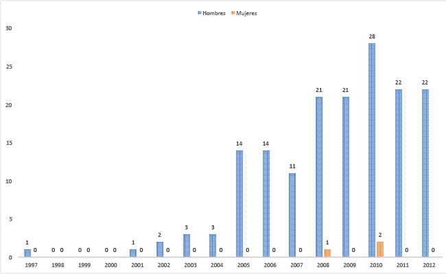 Gráfica 5. Hombres y mujeres condenadas por acoso sexual, hostigamiento sexual y aprovechamiento sexual, en el fuero común, 1997-2012