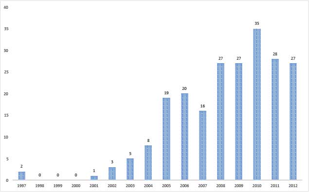 | 1997 | 1998 | 1999 | 2000 | 2001 | 2002 | 2003 | 2004 | 2005 | 2006 | 2007 | 2008 | 2009 | 2010 | 2011 | 2012 | |