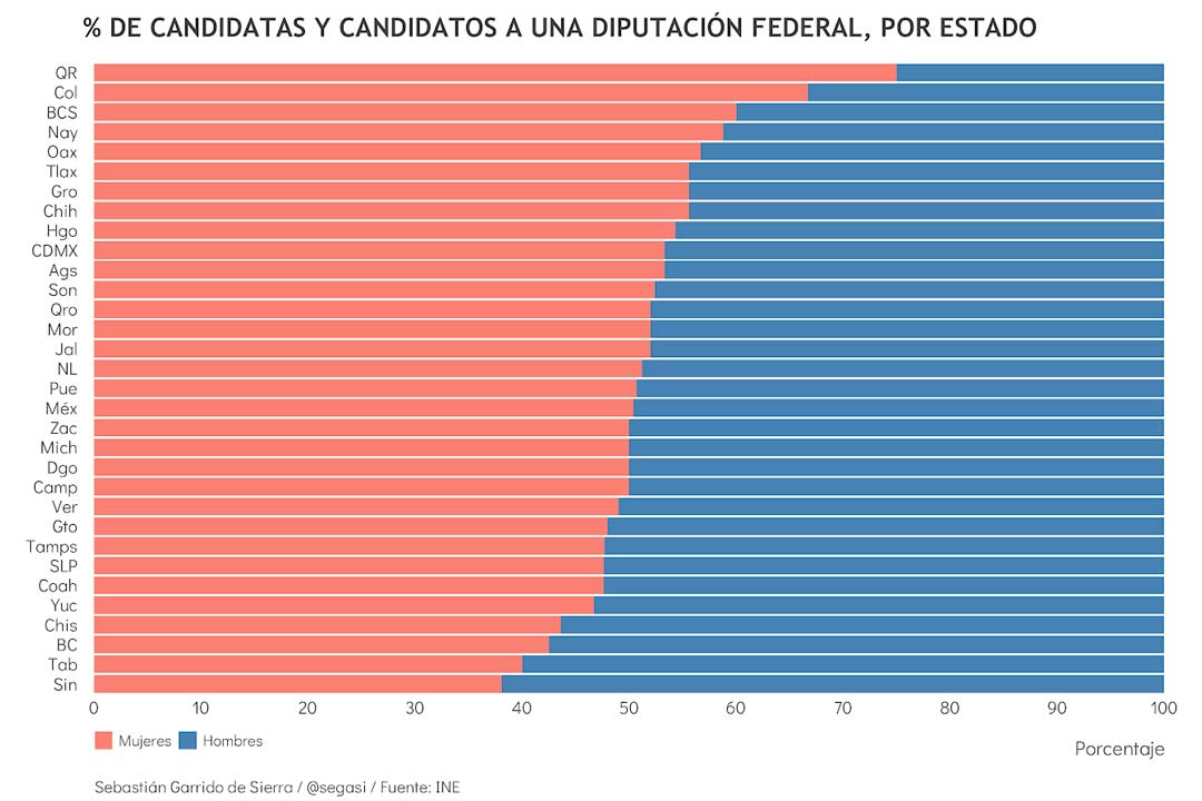 Comienzo con datos agregados a nivel estatal: en 22 de las entidades del país 50% o más de las candidaturas a diputaciones federales de mayoría relativa fueron asignadas a mujeres. Sin embargo, detrás de esta cifra hay una enorme variación. En un extremo, 75% de las 12 candidaturas a una diputación federal de Quintana Roo fueron asignadas a mujeres. En el otro, solo 38.1% de las 21 candidaturas de Sinaloa se asignaron a una mujer.