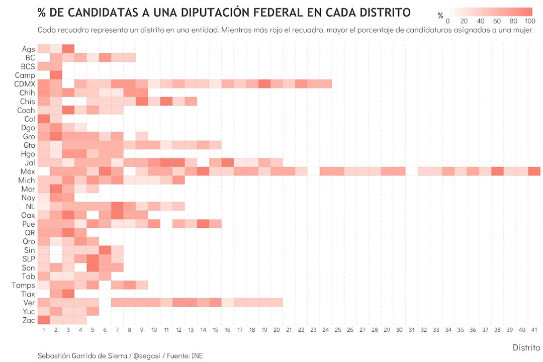 La siguiente gráfica ofrece una perspectiva más detallada de estos datos. Muestra el porcentaje de candidaturas a una diputación federal asignadas a mujeres en cada uno de los 300 distritos del país. Cada recuadro representa un distrito (columnas) en la entidad correspondiente (renglones). Los recuadros están ordenados de izquierda a derecha de acuerdo con el número de distrito que representan. Mientras más rojo el recuadro, mayor el porcentaje de candidaturas asignadas a una mujer. El número de candidaturas por distrito oscila entre tres y siete.6