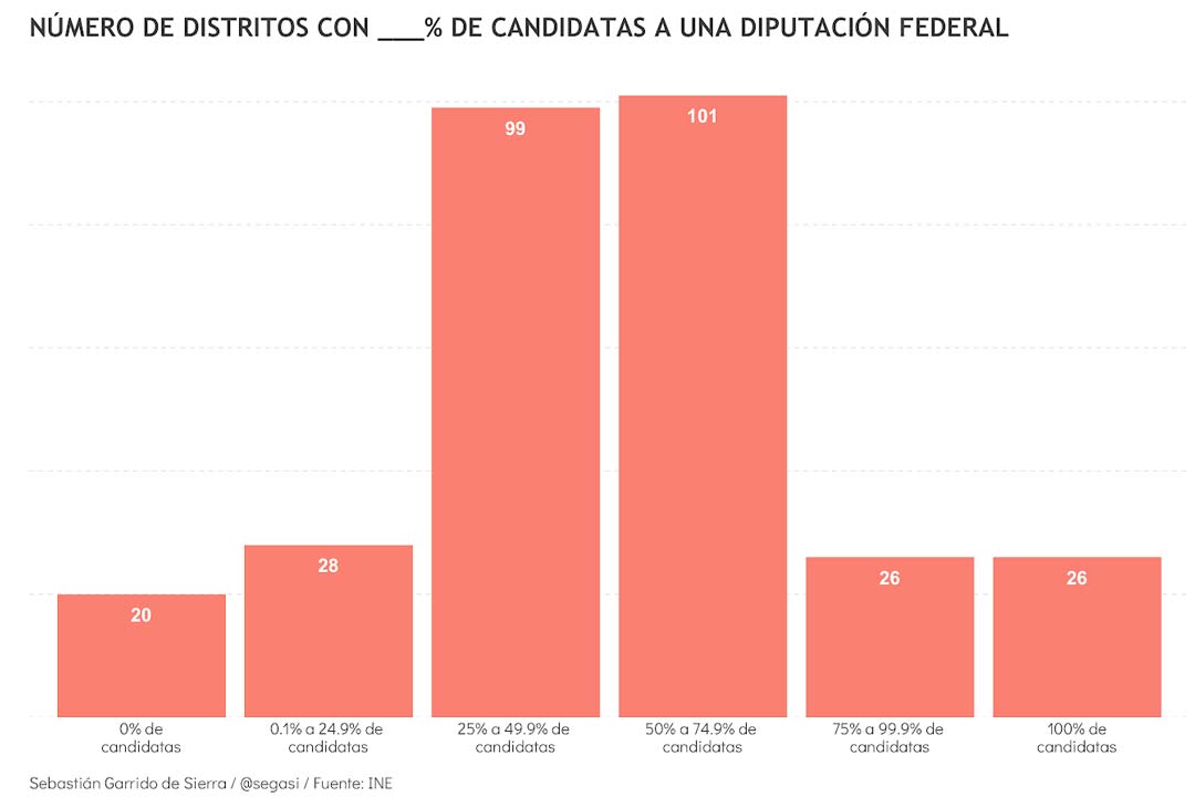 Al igual que en el ámbito estatal, los datos revelan diferencias sustantivas a nivel distrital. Por un lado, en 26 de los 300 distritos federales el 100% de las candidaturas fueron asignadas a mujeres. Cuatro de estos 26 distritos se ubican en el Estado de México (dttos. 6, 14, 38 y 41), tres en Jalisco (11, 12 y 16), dos en Chiapas (9 y 11) y dos más en Oaxaca (3 y 7). Por el otro lado, en 20 distritos todos los candidatos a diputado federal son hombres. Nuevamente, cuatro de estos distritos se ubican en el Estado de México (1, 8, 23 y 31), dos en Chiapas (3 y 4) y dos más en Oaxaca (5 y 10).