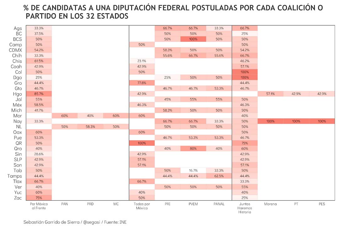 Tercero, únicamente las coaliciones Todos por México y Juntos Haremos Historia asignaron el 100% de las candidaturas a mujeres en al menos una entidad. La primera lo hizo en Quintana Roo y la segunda en Colima y Durango.