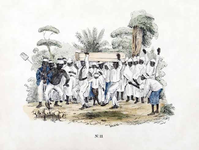 Funeral en una plantación. Litografía impresa alrededor de 1840-1850, restaurada digitalmente. Lo que aquí se narra fue contado en la cultura de las plantaciones de caña de azúcar.