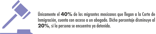 Únicamente el 40% de los migrantes mexicanos que llegan a la Corte de Inmigración, cuenta con acceso a un abogado. Dicho porcentaje disminuye al 20%, si la persona se encuentra ya detenida