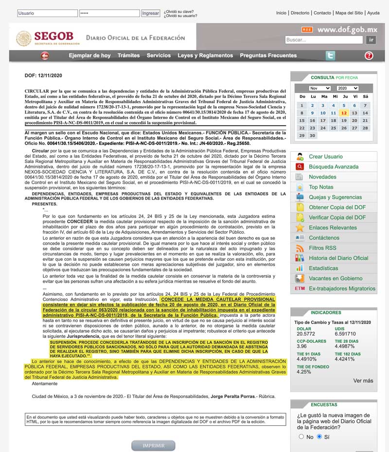 Después de que la semana pasada el Tribunal Federal de Justicia Administrativa ordenara a la Secretaría de la Función Pública (SFP) suspender la sanción en contra de Nexos Sociedad Ciencia y Literatura SA de CV —razón social que incluye a la revista Nexos y a la editorial Cal y Arena—, hoy la SFP ha publicado dicha suspensión en el Diario Oficial de la Federación.
