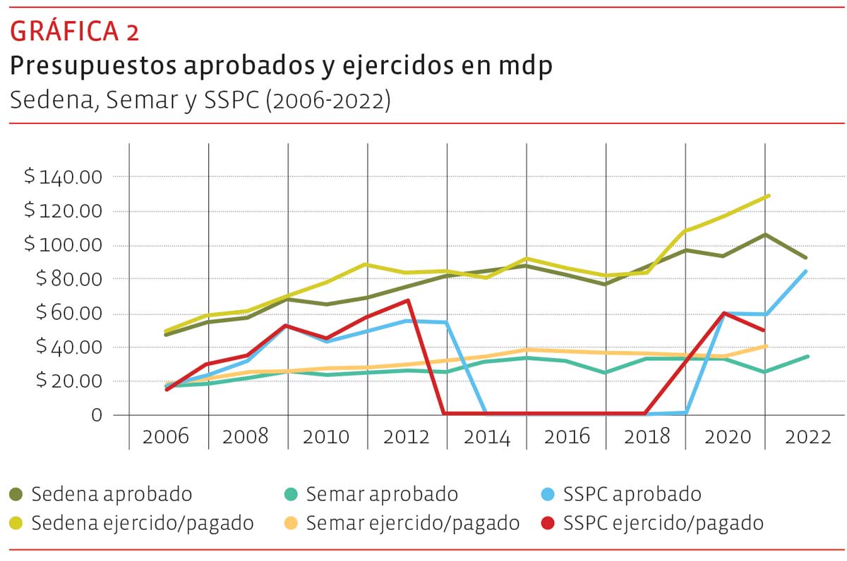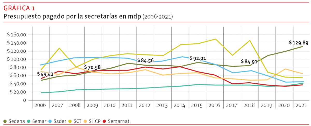 La transferencia de funciones del gobierno civil a las FF. AA. ha conllevado una deformación importante de los presupuestos públicos, desequilibrándolos en favor de las instituciones castrenses y en detrimento de las dependencias civiles que detentan las funciones transferidas. Por ejemplo, mientras que los recursos entregados a la Secretaría de la Defensa Nacional (Sedena) entre 2006 y 2021 crecieron 163 %, el dinero destinado a las Secretarías de Comunicaciones y Transportes (SCT), Agricultura y Desarrollo Rural (Sader), Hacienda y Crédito Público (SHCP) y Medio Ambiente y Recursos Naturales (Semarnat) ha disminuido significativamente y el destinado al subsidio federal de policías municipales ha desaparecido (ver gráfica 1).