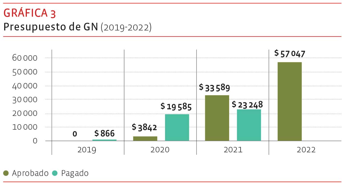 En 2019, la GN ejerció 836 mdp sin tener presupuesto asignado mientras que, en 2020, la corporación ejerció 19 585 mdp a pesar de tener sólo 3842 mdp aprobados. Y aunque en 2021 ejerció únicamente 23 010 mdp de los 33 589 mdp que se le asignaron, al año siguiente se le aprobaron 57 047 mdp, equivalente a lo recibido por toda la SSPC en 2021. No obstante, estas cifras no bastan para cuantificar el presupuesto total de la GN debido a su estructura, pues está conformada por algunos elementos de la extinta Policía Federal y en un 80 % por militares y marinos, y a que la Sedena es dueña de sus cuarteles y su armamento y equipo provienen de la Policía Militar (ver gráfica 3).