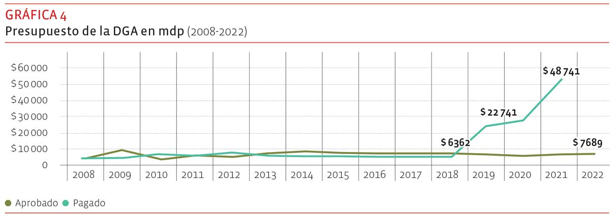 Uso de fideicomisos públicos. La Dirección General de Administración (DGA) de la Sedena controla y evalúa el gasto público de la secretaría. A pesar de mantener su presupuesto aprobado debajo de los 8000 mdp desde 2006, su monto ejercido ascendió a 22 741 mdp en 2019 y 48 741 mdp en 2021. La mayor parte se destinó al concepto de “aportaciones a fideicomisos públicos”, que no tenía presupuesto previsto antes de 2018 y ha ejercido 82 800 mdp entre 2019 y 2021 (ver gráfica 4).