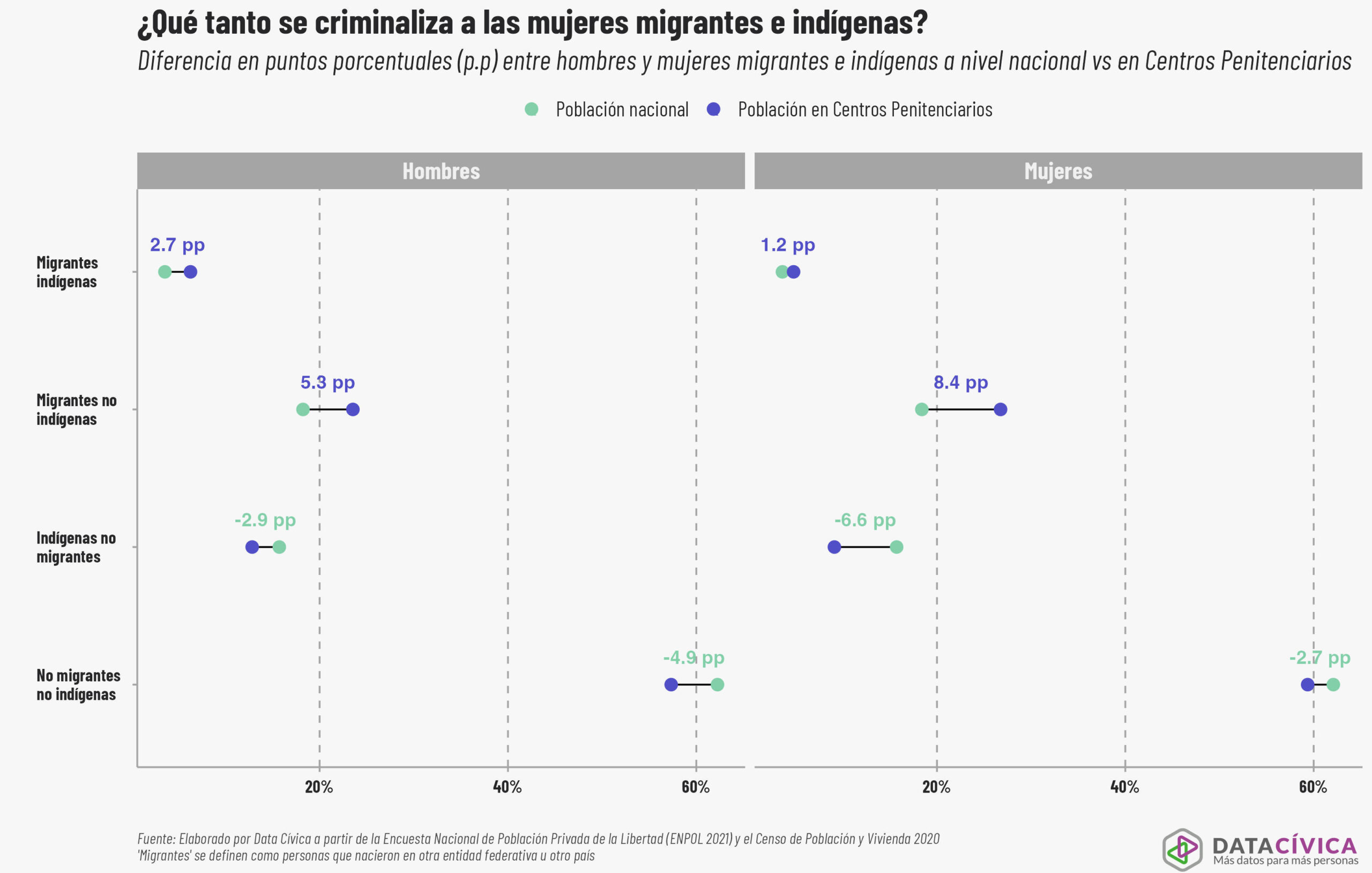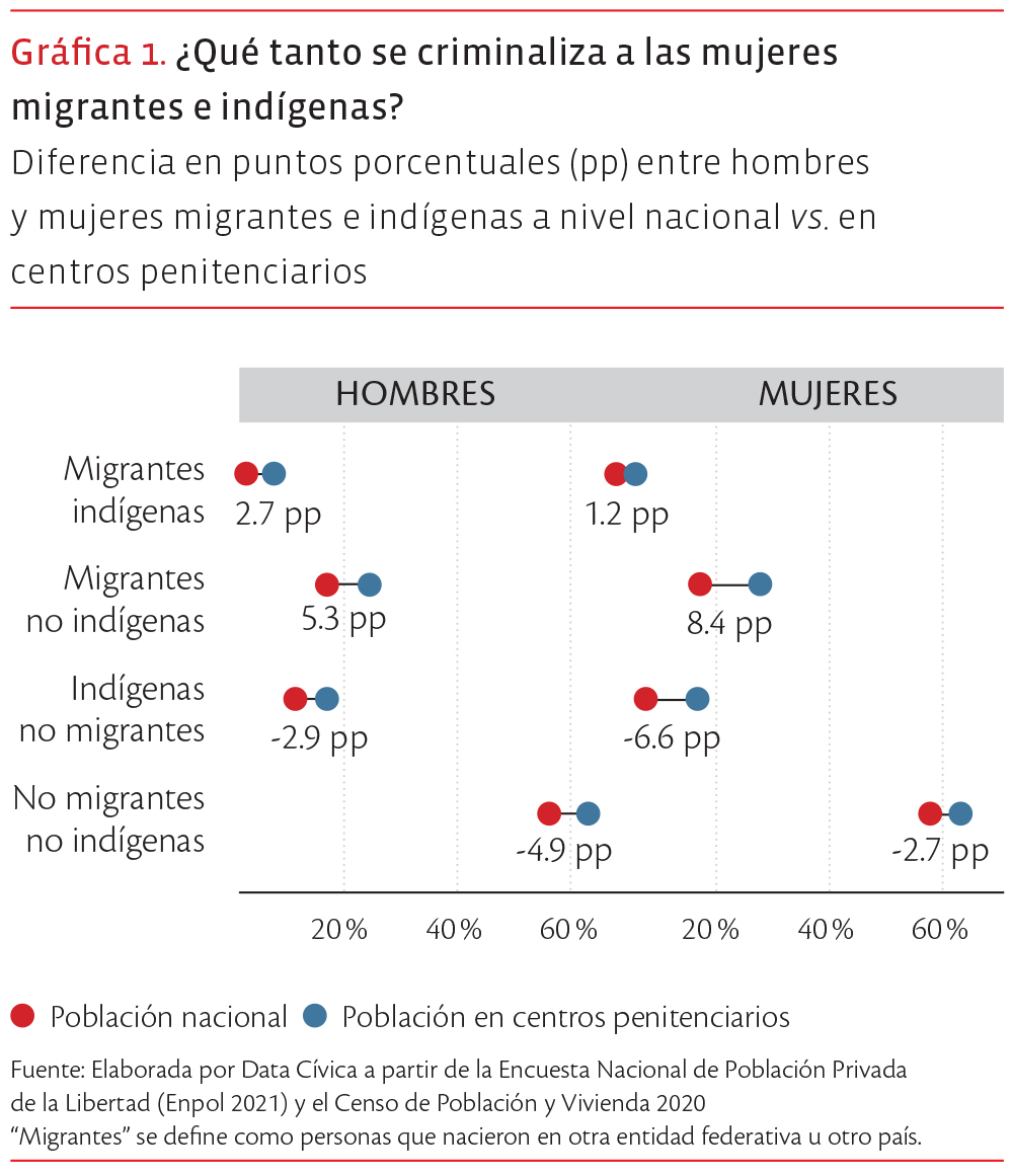 Comparamos el porcentaje de personas migrantes e indígenas en los centros penitenciarios con su peso en la población en general y lo que encontramos fue que ser mujer, migrante y no pertenecer a un grupo indígena son factores que más predisponen a criminalizarlas. Esto se evidencia en una notable sobrerrepresentación: las mujeres migrantes no indígenas en el sistema penitenciario tienen una diferencia de 8.4 puntos porcentuales (pp) por encima de su proporción en la población general. Paralelamente, los hombres en esta misma circunstancia también son criminalizados de manera elevada, con una sobrerrepresentación de 5.3 pp. En este contexto, entendemos la sobrerrepresentación como una señal que nos dice que estos grupos son encarcelados en mayor medida que el resto de la población.