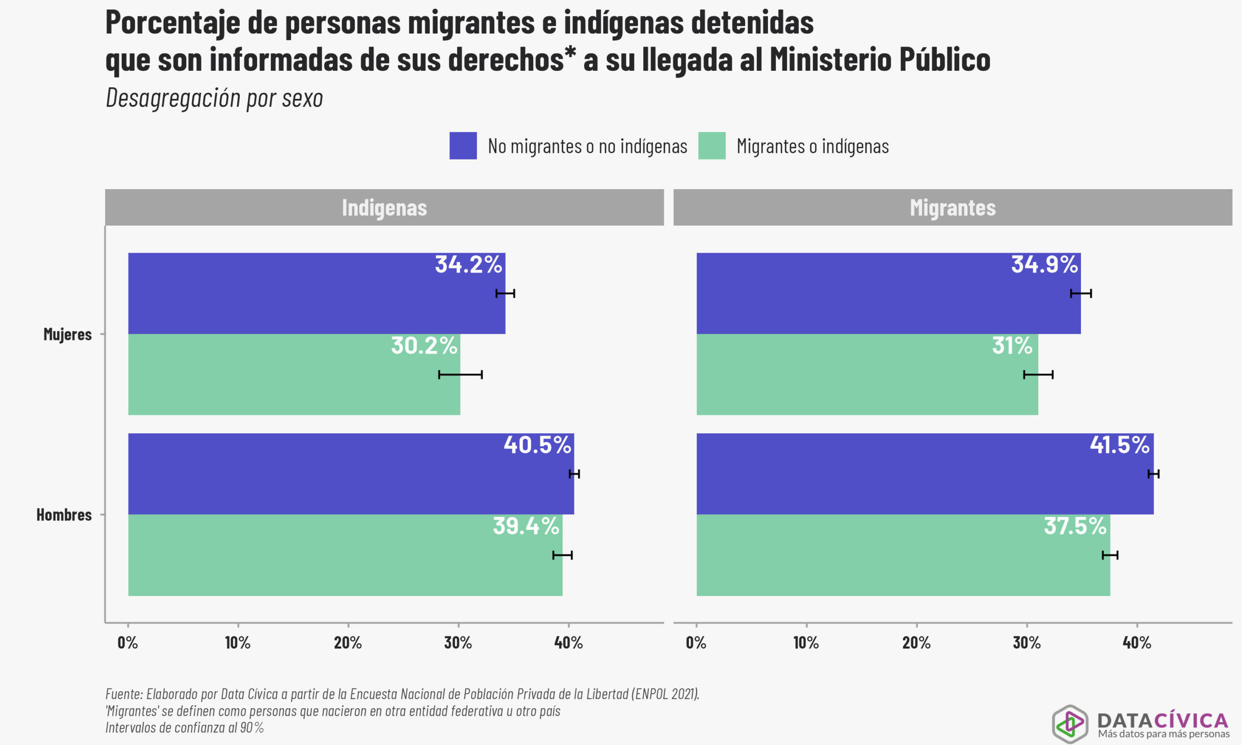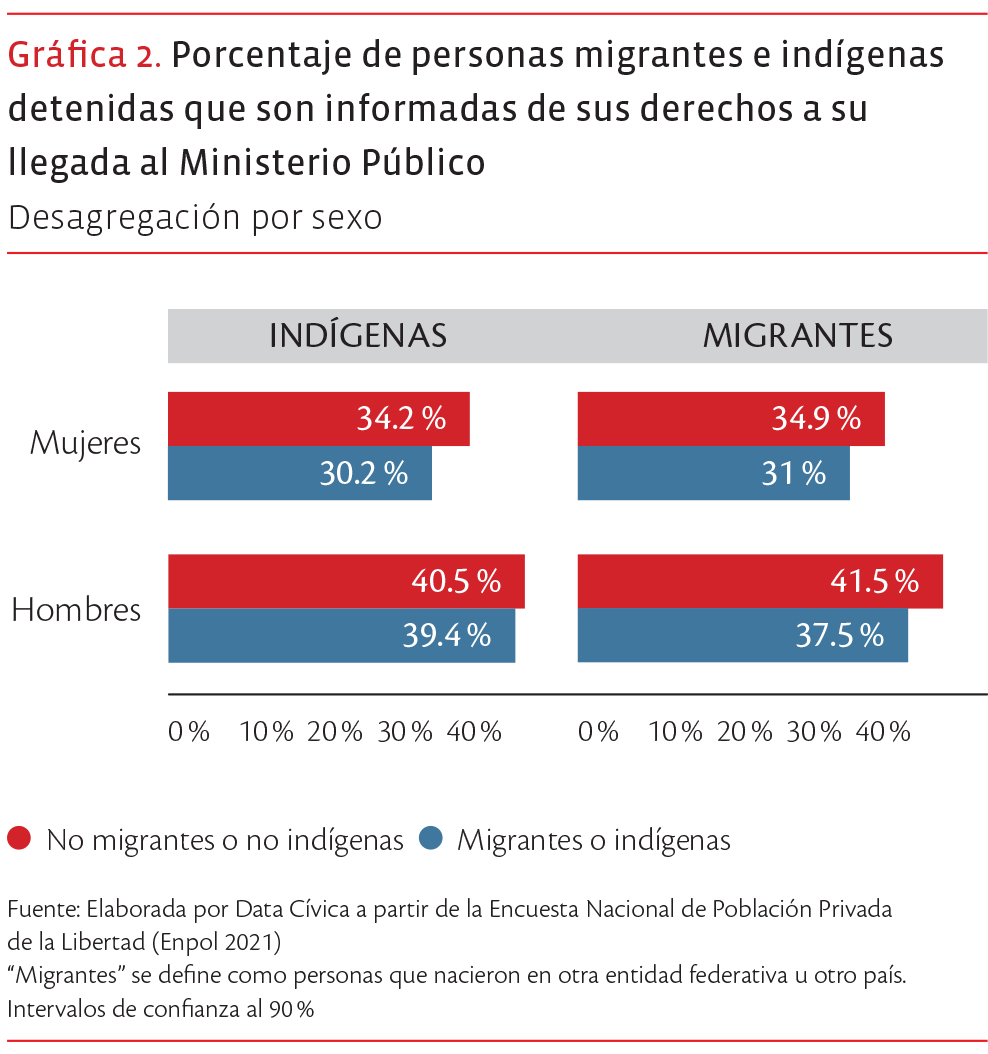 Informar a una persona sobre sus derechos no es un formalismo, sino la primera defensa contra la arbitrariedad, y es precisamente aquí donde el sistema vuelve a fallar de forma diferenciada. Al analizar la Encuesta Nacional de Población Privada de la Libertad (Enpol),6 observamos que cuando una mujer es detenida, es menos probable que le sean leídos sus derechos que a un hombre. Pero cuando una mujer índigena es detenida, es aún menos probable que sea informada de sus derechos en comparación a una mujer que no es indígena. Mientras que al 34.2 % de las mujeres que no son indígenas se les respeta este derecho cuando llegan al Ministerio Público, esta cifra cae al 30.2 % cuando se trata de mujeres indígenas. De igual manera, sólo el 31 % de las mujeres migrantes reciben esta información básica, frente al 34.9 % de sus contrapartes no migrantes. En todos los casos, tanto para hombres como para mujeres, pertenecer a un grupo indígena o migrante reduce las probabilidades de ser informado de sus derechos procesales.