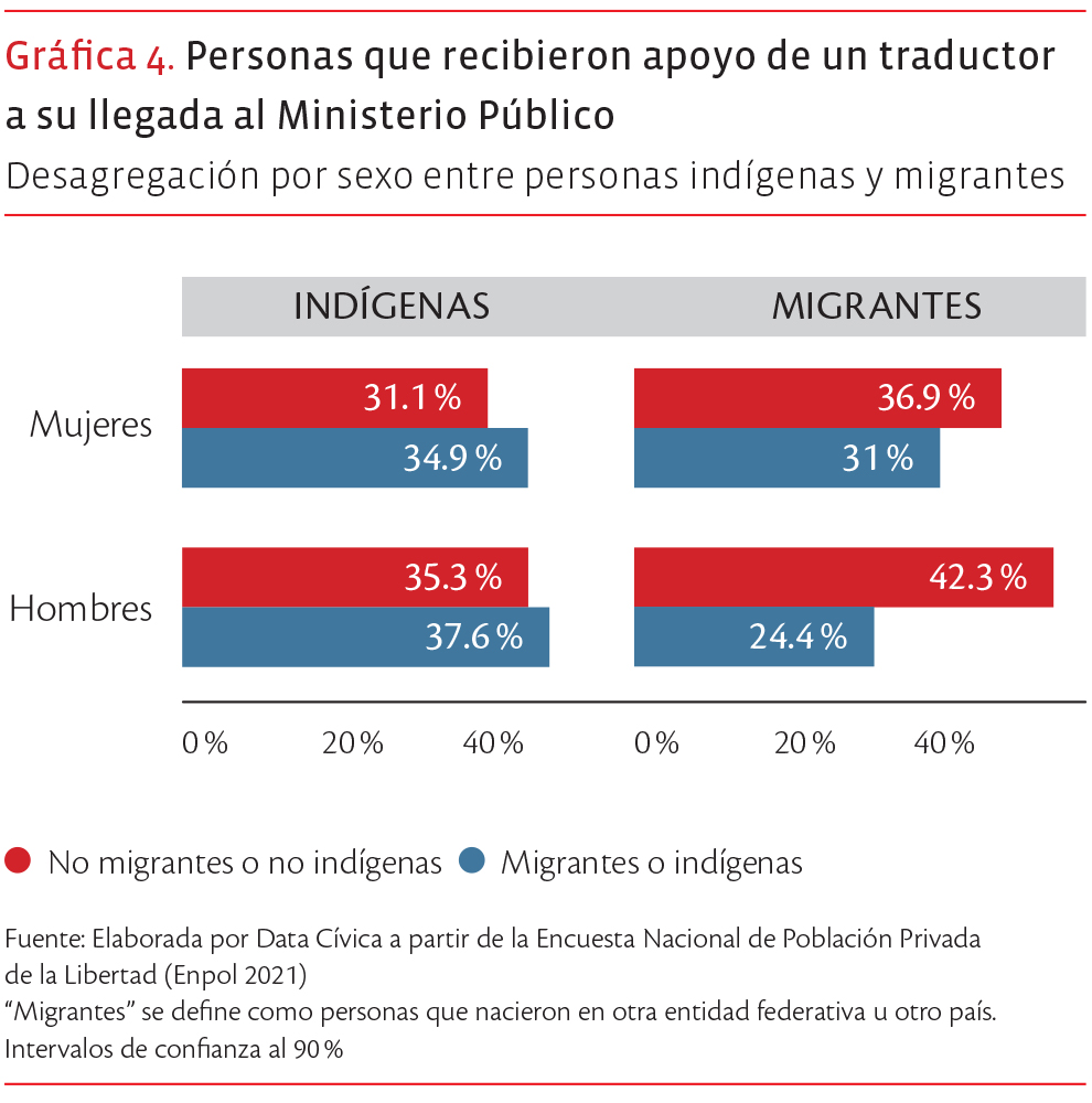 Si el acceso a un abogado es limitado, la posibilidad de contar con un traductor tiene matices aún más complejos. Al llegar al Ministerio Público los datos muestran una asistencia que parece no responder a la necesidad real de los grupos vulnerables. No obstante, aquí hay que ser cuidadosos con lo que comparamos.