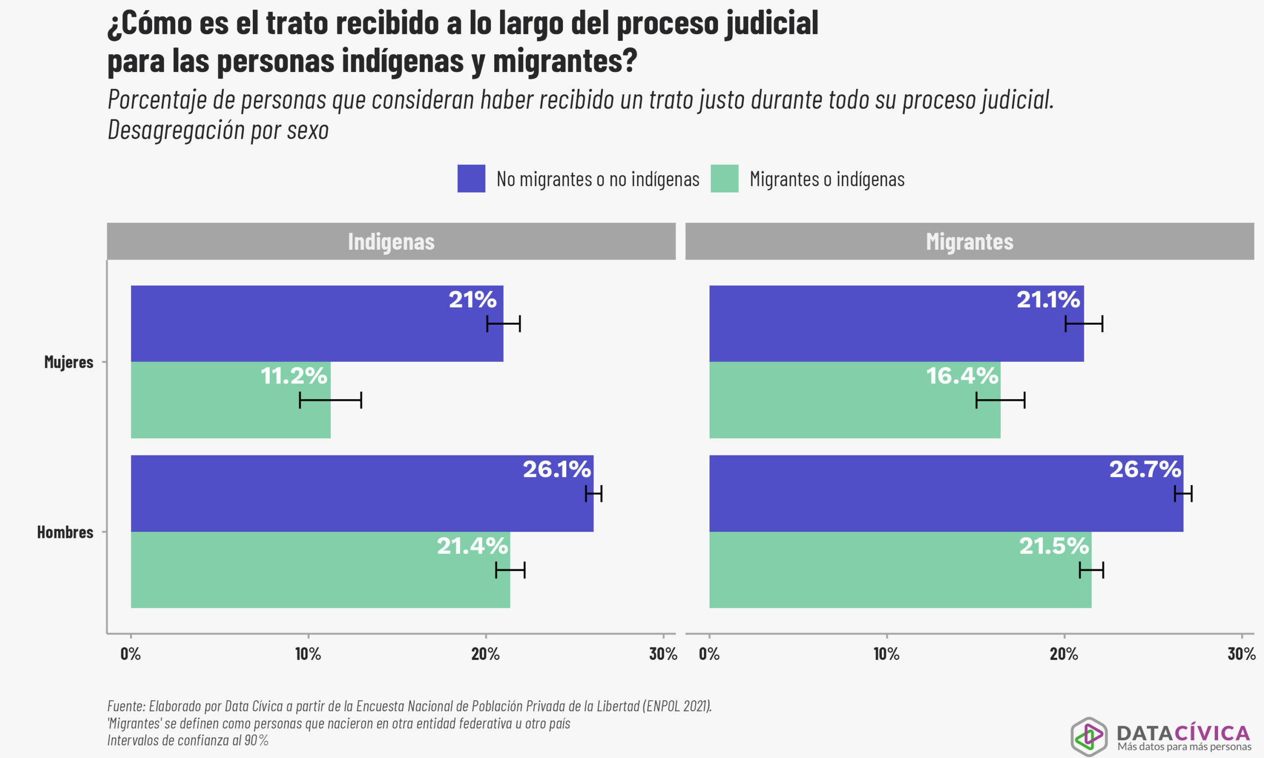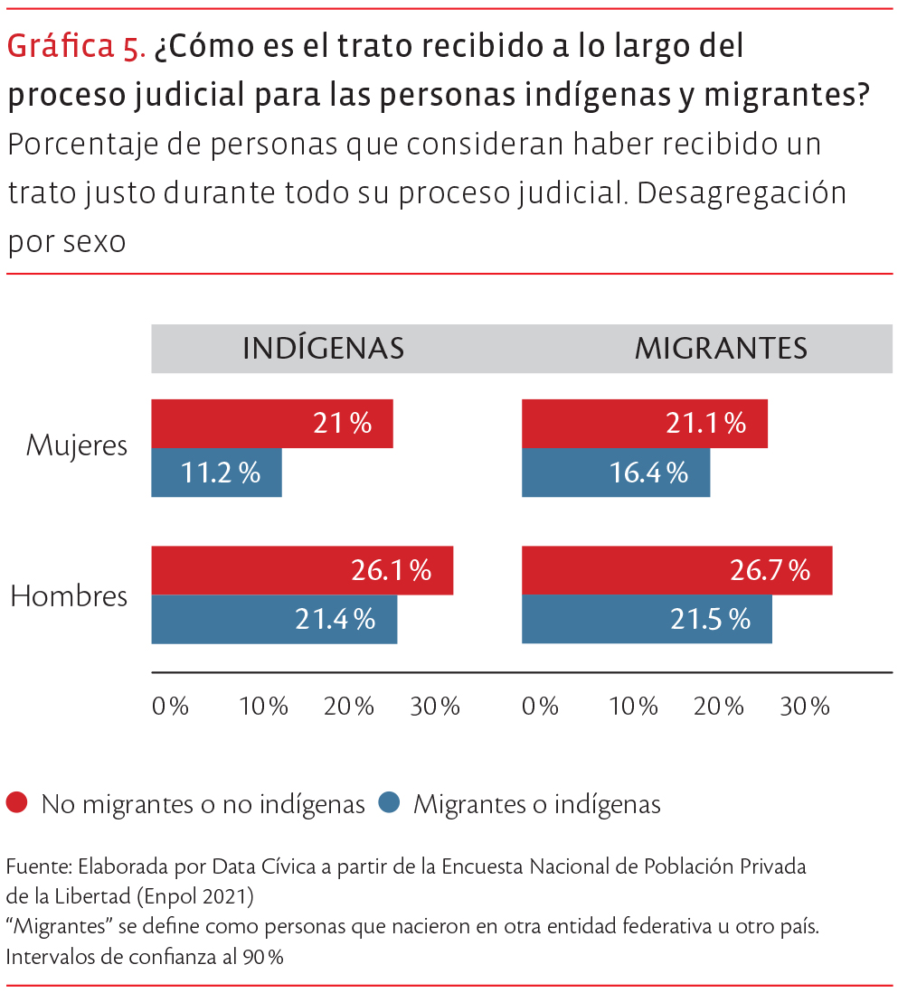 Por último nos queda preguntarnos: ¿cómo perciben las mujeres la experiencia de haber vivido un proceso judicial? Éste es un indicador clave porque al final es el que nos dice si el sistema de justicia logró brindarles lo necesario para su justa defensa y debido proceso. Mientras que el 21 % de las mujeres no indígenas consideran que recibieron un trato justo, esta percepción cae drásticamente al 11.2 % entre las mujeres indígenas. Esta diferencia de casi la mitad confirma que para ellas el sistema es doblemente hostil. En el caso de las mujeres migrantes, sólo el 16.4 % percibe justicia en su proceso, frente al 21.1 % de sus contrapartes no migrantes.
