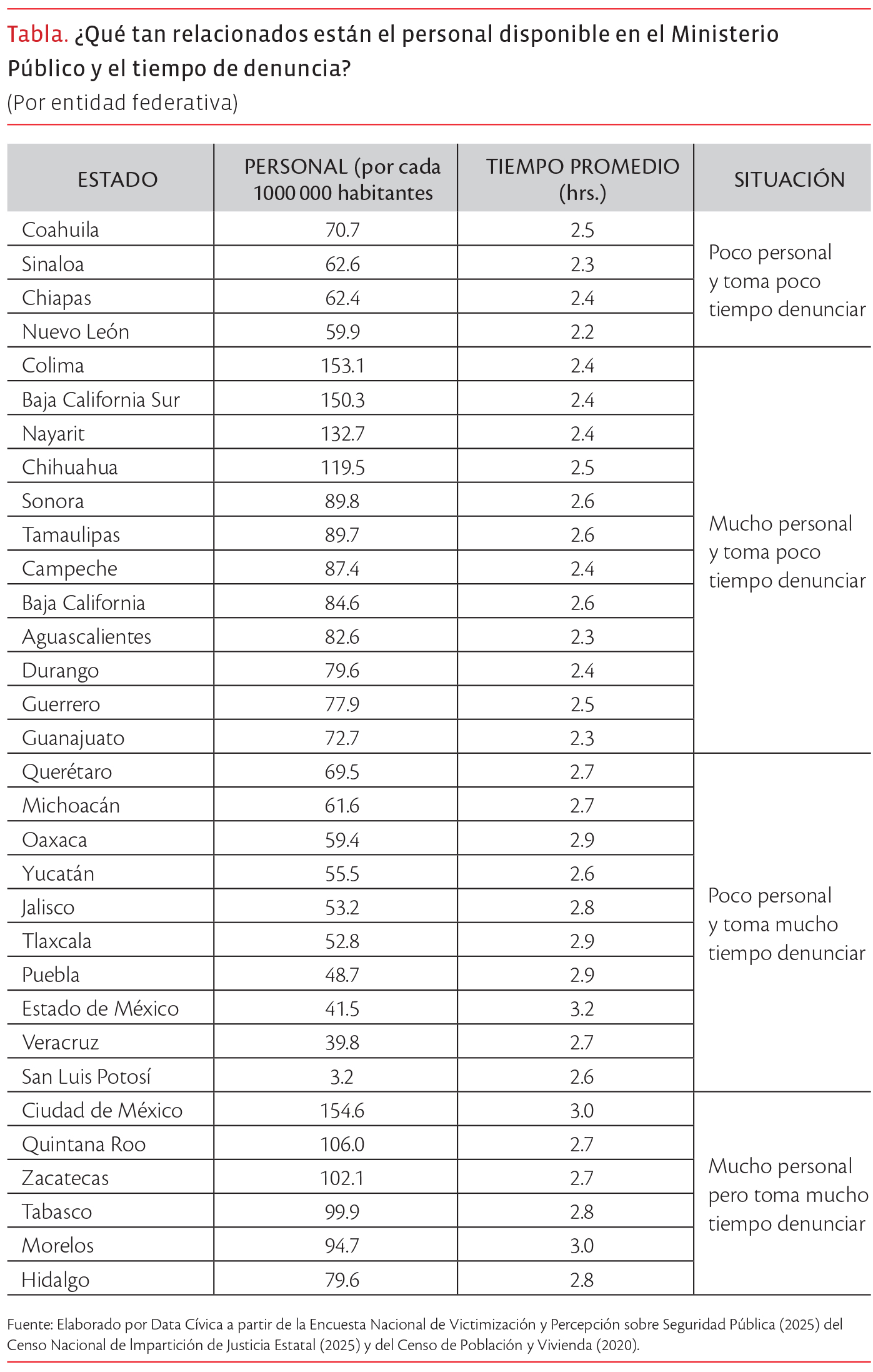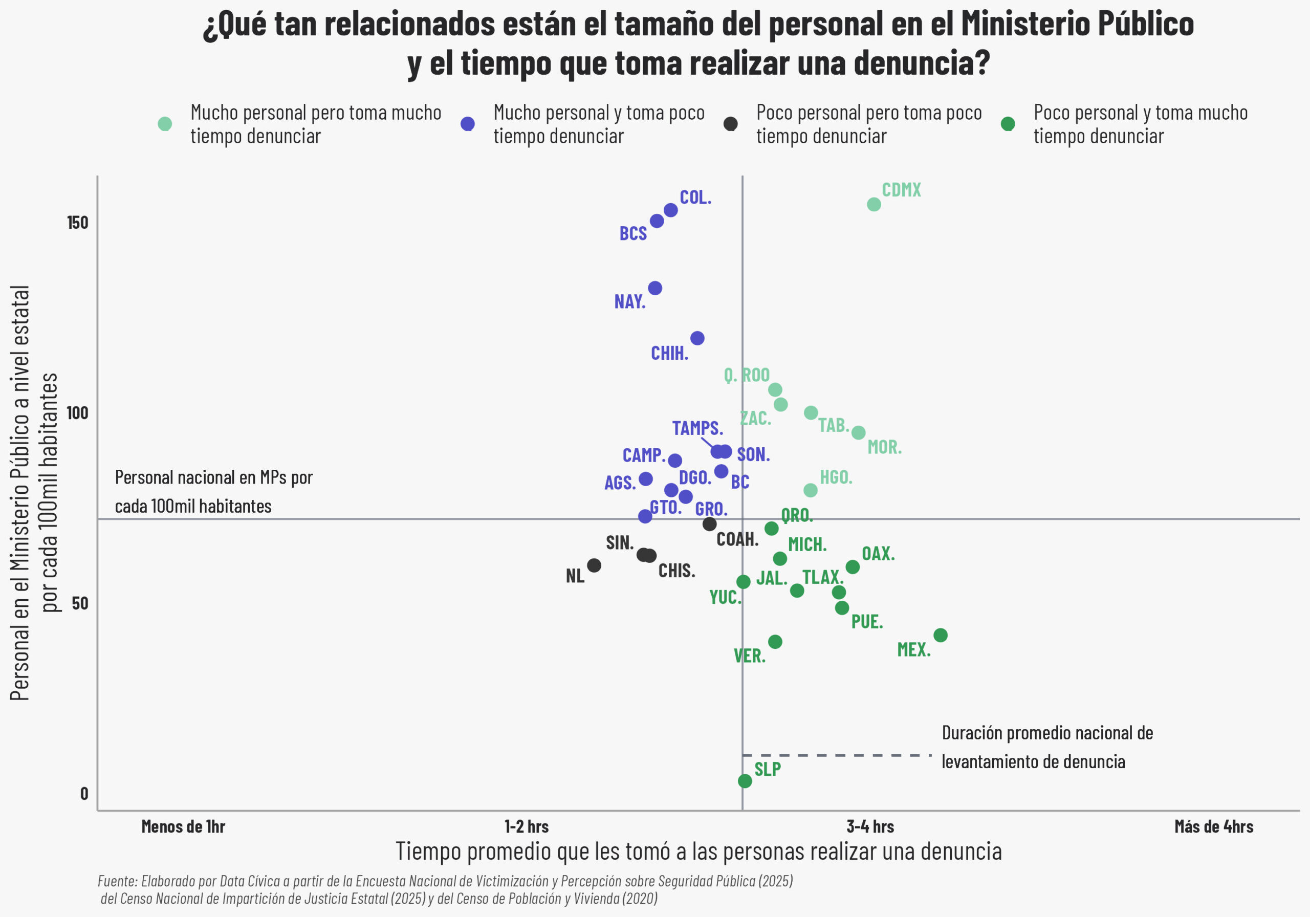 Si observamos la cantidad de personal que hay en los Ministerios Públicos en cada entidad por cada 100 000 habitantes y el tiempo promedio que le toma a una persona realizar una denuncia, el resultado nos dice que la eficiencia no siempre sigue una lógica lineal de a más manos, más rapidez. Por ejemplo, entidades como Ciudad de México y Quintana Roo cuentan con una plantilla de personal muy superior al promedio nacional y, sin embargo, presentan tiempos de espera tan altos como los de estados con pocos recursos. Por otro lado, Oaxaca, Puebla y el Estado de México se ubican en la zona crítica. Tienen muy poco personal y como consecuencia previsible, los tiempos de espera son más largos: entre tres y cuatro horas.