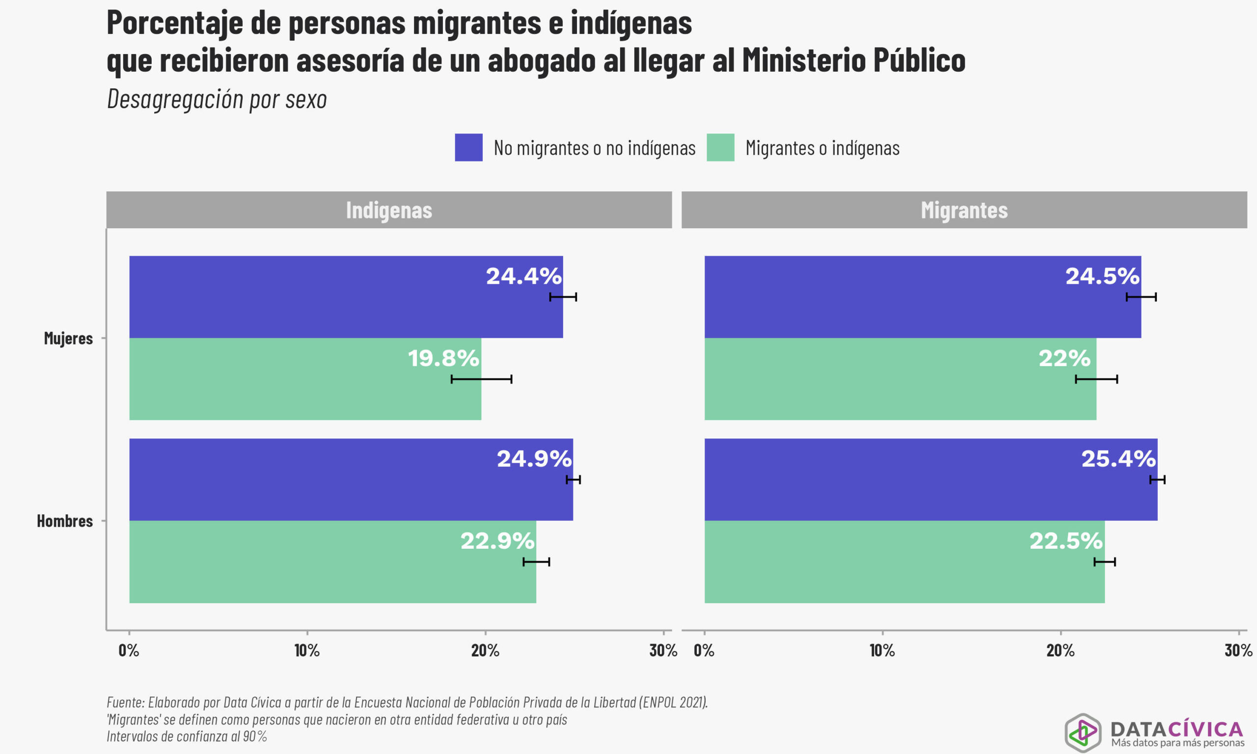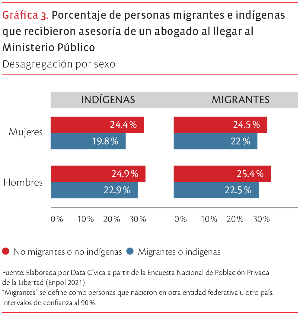 Analizamos los datos sobre asesoría jurídica al llegar al Ministerio Público y lo más destacado es que, en general, apenas tres de cada diez personas detenidas que llegan a un MP reciben asesoría de un abogado. Si observamos específicamente la situación de las mujeres, confirmamos que esta brecha en la defensa legal se profundiza de manera significativa. La desprotección es más acentuada para las mujeres indígenas, de las cuales sólo el 19.8 % cuenta con asesoría legal al inicio de su proceso, en contraste con el 24.4 % de las mujeres que no pertenecen a este grupo. Una dinámica similar ocurre con las mujeres migrantes, cuyo acceso a la defensa es del 22 %, frente al 24.5 % de sus contrapartes no migrantes. Si bien los hombres presentan probabilidades ligeramente mayores de recibir asesoría, la desventaja persiste de forma sistemática para los grupos en situación de vulnerabilidad.