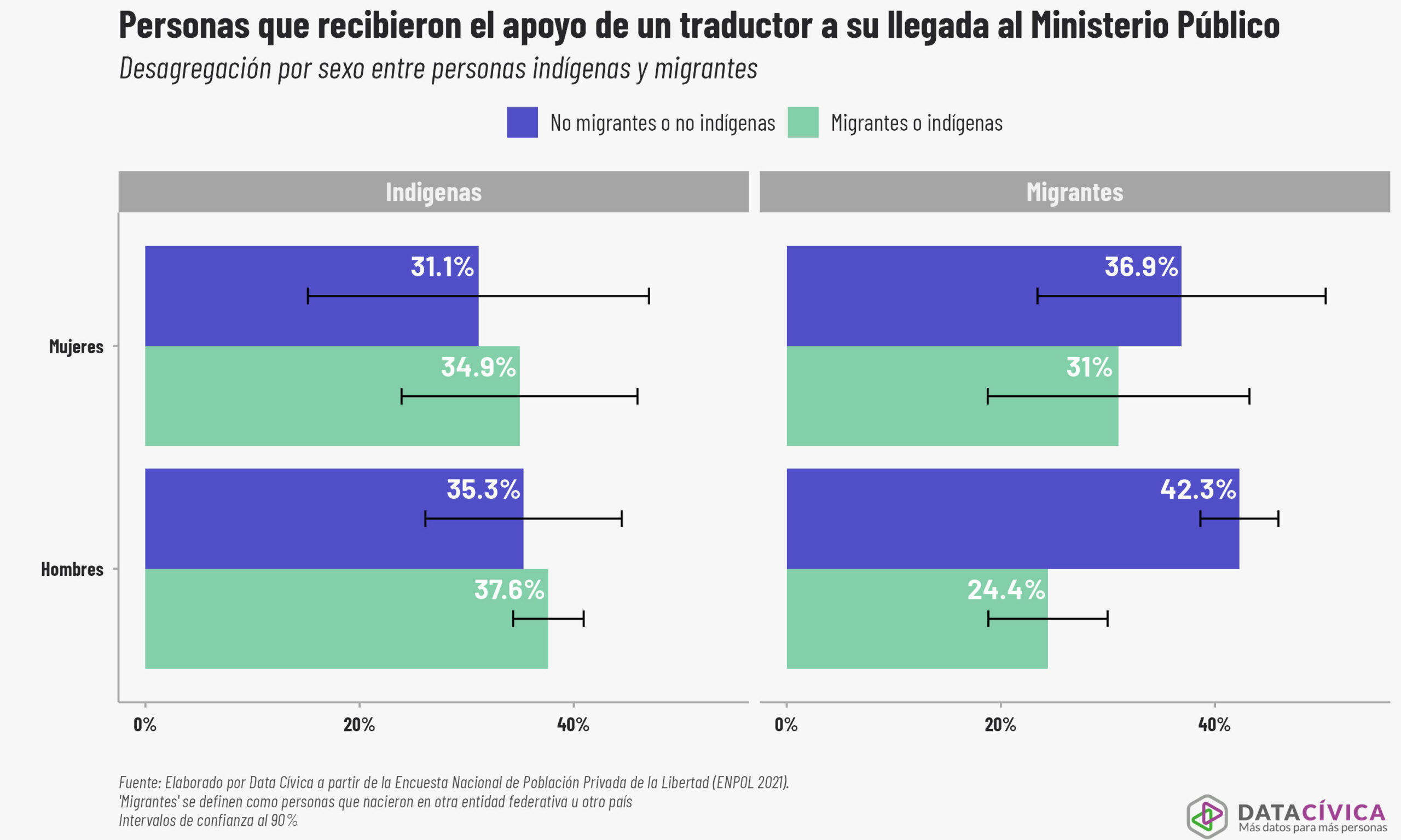 Sin embargo, dado que los intervalos de confianza se superponen, no es posible comparar que algún grupo de mujeres reciba de manera sistemática una mejor atención que otro. En cambio, sí podemos decir que el 42.3 % de los hombres no migrantes ni indígenas recibió apoyo de traducción o interpretación, ese porcentaje se reduce a 24.4 % entre los hombres migrantes. Esta diferencia de casi 18 puntos porcentuales indica que los hombres en contexto de movilidad enfrentan mayores barreras para acceder a ese tipo de apoyo (ver gráfica 5).